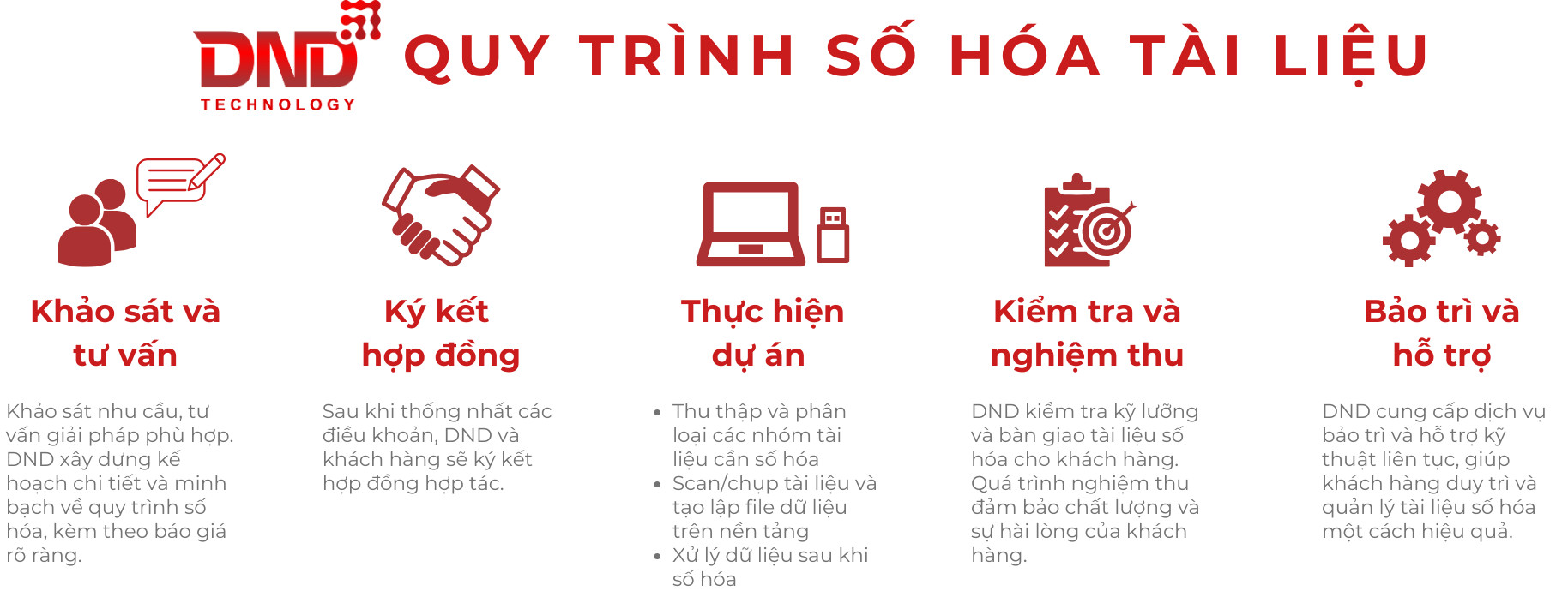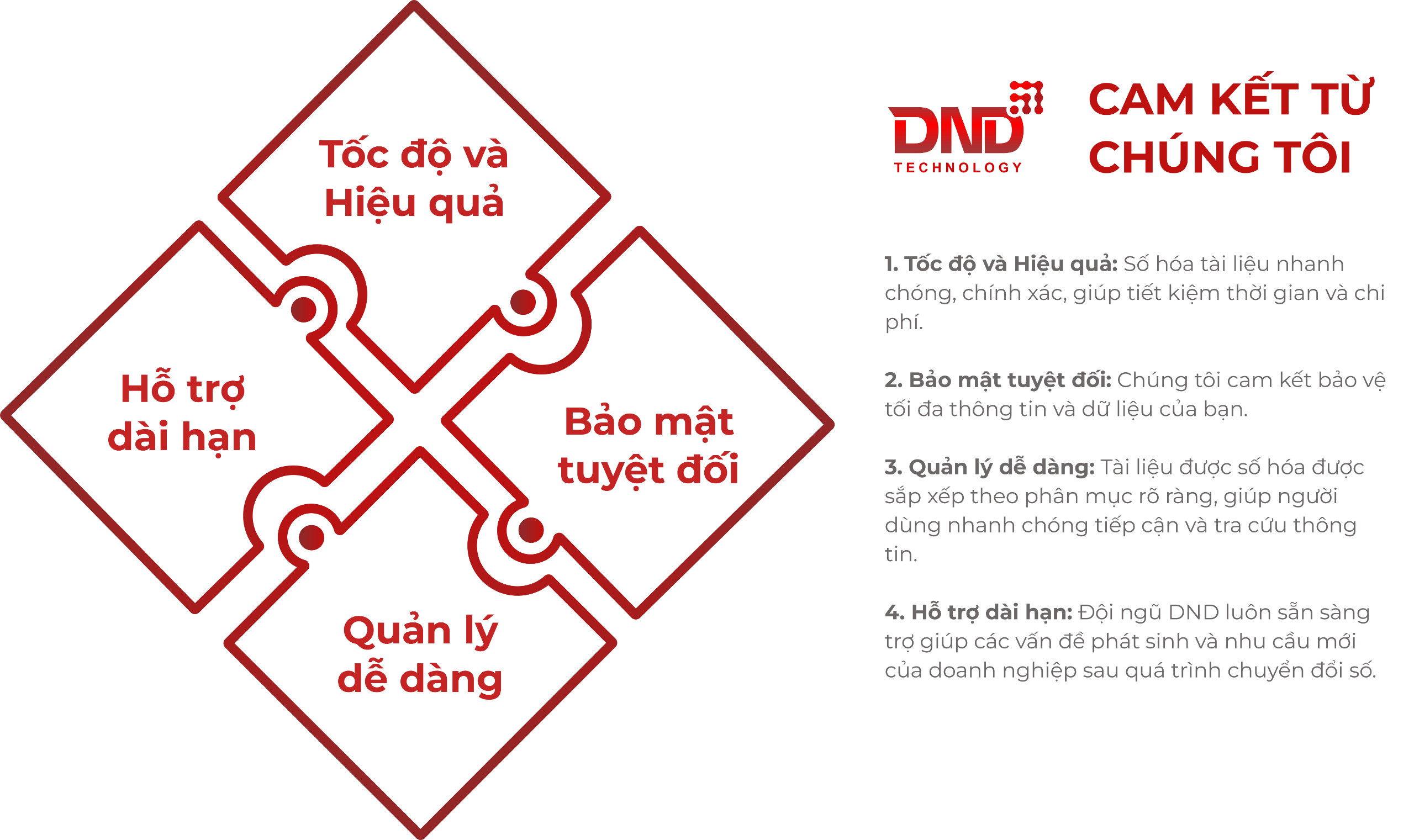 Với công nghệ tiên tiến và đội ngũ chuyên gia giàu kinh nghiệm, DND cam kết đem đến giải pháp số hóa tài liệu: